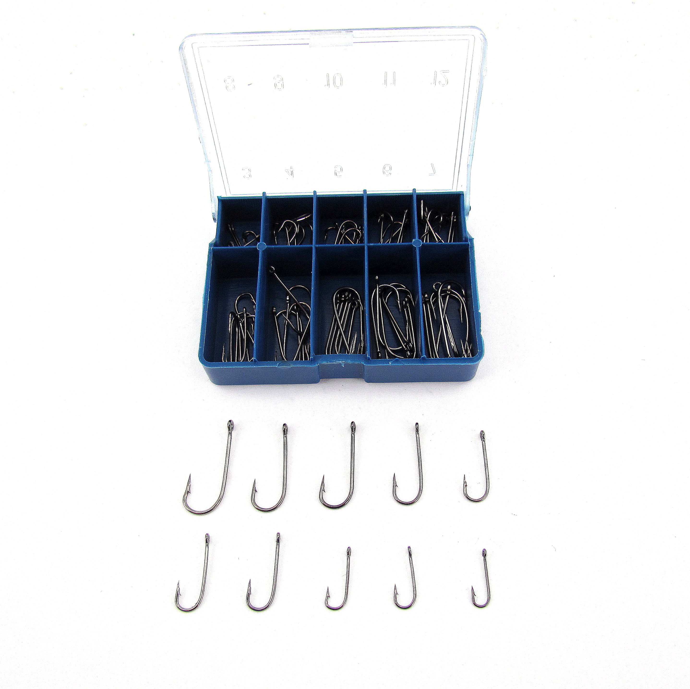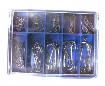 Die Angelhaken sind nummeriert in einer Kunstoff Box.